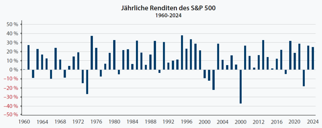 Alphabet, unsere größte Tech-Position, hat allein in den letzten vier Wochen 25 % zugelegt. Wir hatten Alphabet deshalb hoch gewichtet, weil die Aktie vor dem Hintergrund der starken Marktposition des Unternehmens noch deutlich günstiger war als zum Beispiel Apple oder Microsoft. Irgendwann ist sie also zu Ende, die jetzige Boomphase. Um sich zu verdeutlichen, was dann passieren kann, habe ich einmal die jährlichen Renditen des S&P 500 dargestellt.