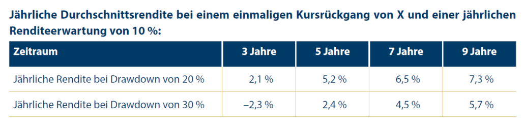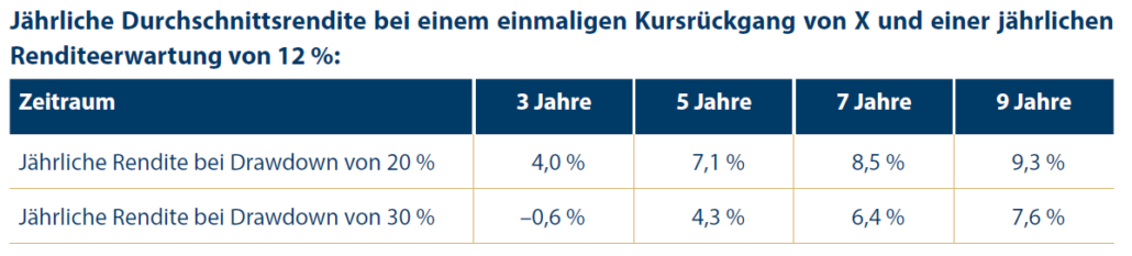 Wenn die Titel des Portfolios eine Renditeperspektive von 12 % p. a. haben, wäre bei 20 % Drawdown nach drei Jahren bereits eine jährliche Rendite von 4 % erreicht und bei einem Drawdown von 30 % stünden Sie nahe dem Breakeven.