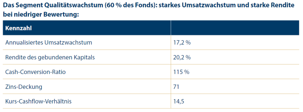 Die Unternehmen des Segments wachsen und haben eine hohe Krisenresilienz. Das durchschnittliche Kurs-Cash-Flow-Verhältnis beträgt 14,5, was in etwa halb so teuer wie der S&P-500 ist. Sie erinnern sich: